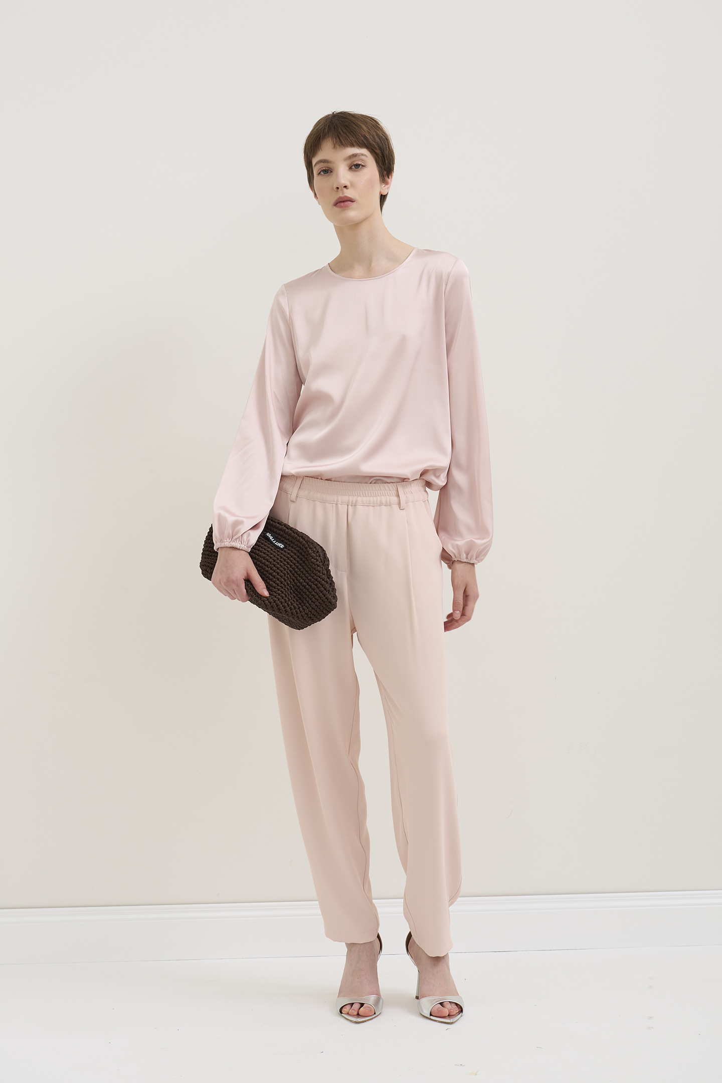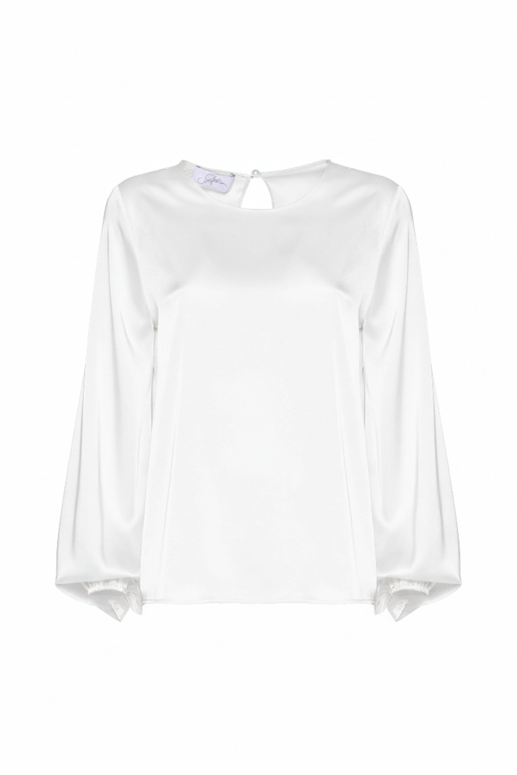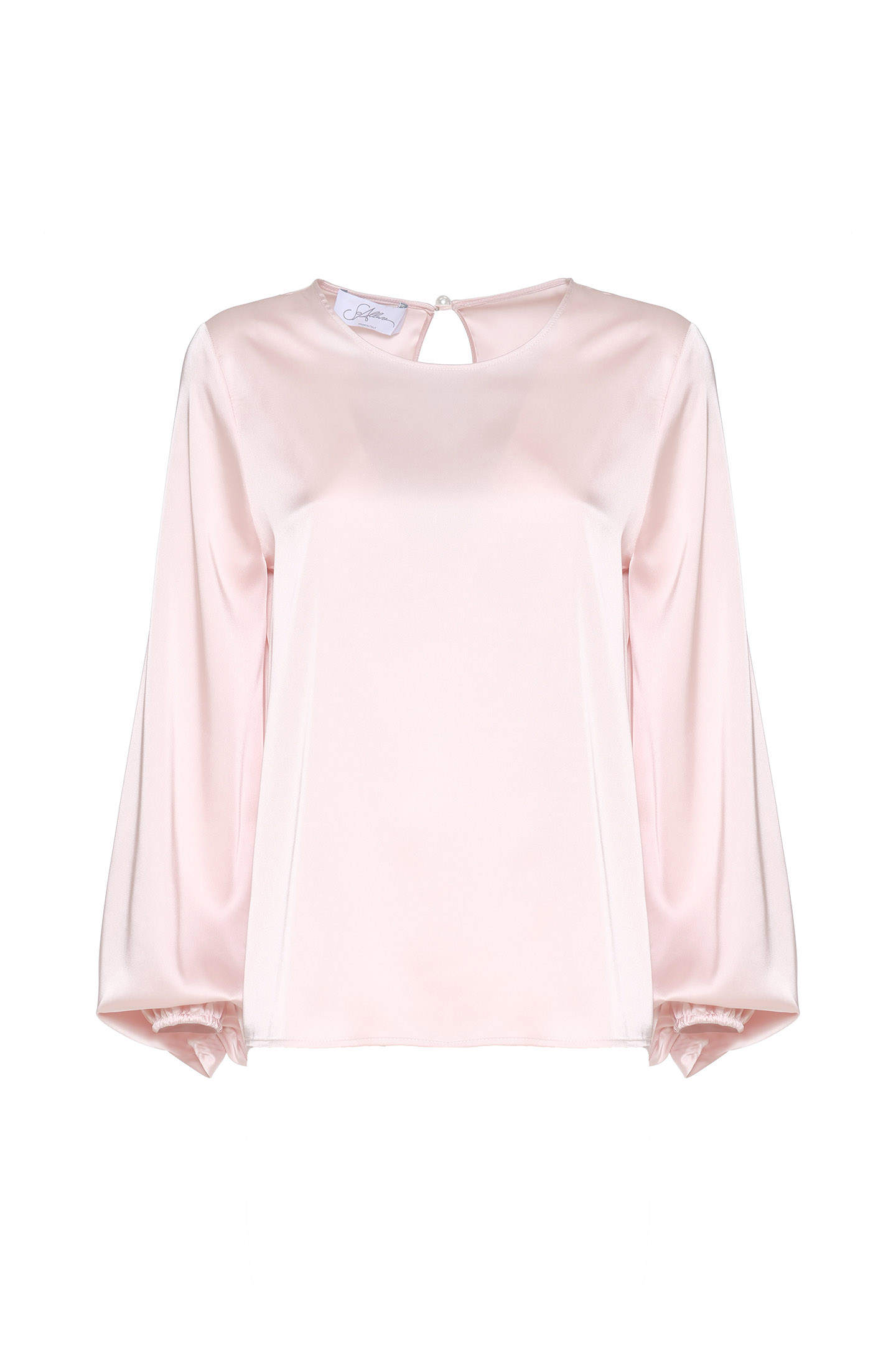 GLOSSY SATIN CREW NECK BLOUSE WITH TEARDROP OPENING AT THE BACK AND PEARL BUTTON CLOSURE. LONG BALLOON SLEEVE DESIGN FINISHED WITH ELASTIC CUFFS. IT FEATURES A SOFT SILHOUETTE, IDEAL FOR ELEGANT LOOKS, BUT WITHOUT SACRIFICING PRACTICALITY. THE MODEL IS 1.78 M TALL AND WEARS A SIZE 42 IT.