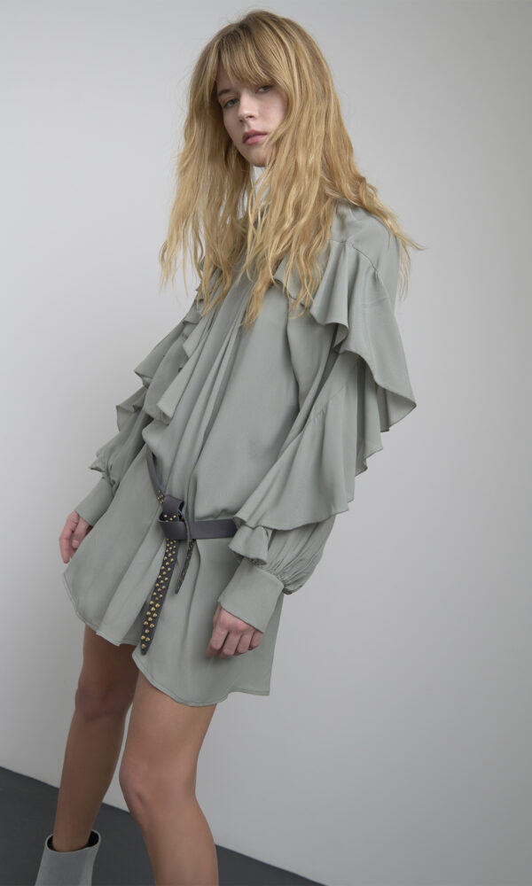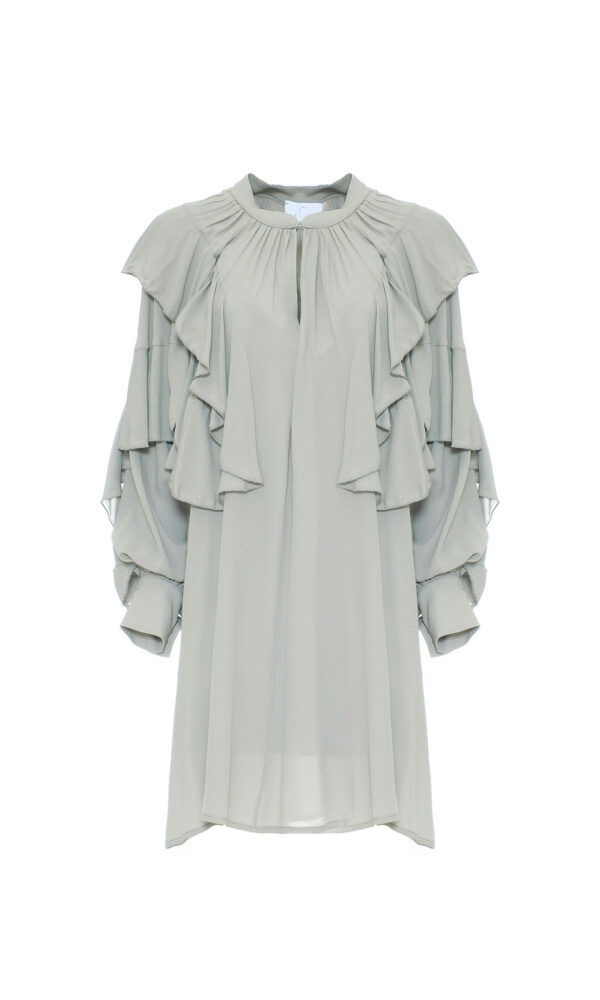 SHORT DRESS IN FLOWING FABRIC, ENHANCED WITH RUFFLES. THE DESIGN FEATURES A BOAT NECKLINE AND WIDE LONG SLEEVES WITH ELASTIC CUFFS. STRAIGHT MODEL WITH A COMFORTABLE FIT, IDEAL FOR FEMININE LOOKS WITHOUT SACRIFICING PRACTICALITY.