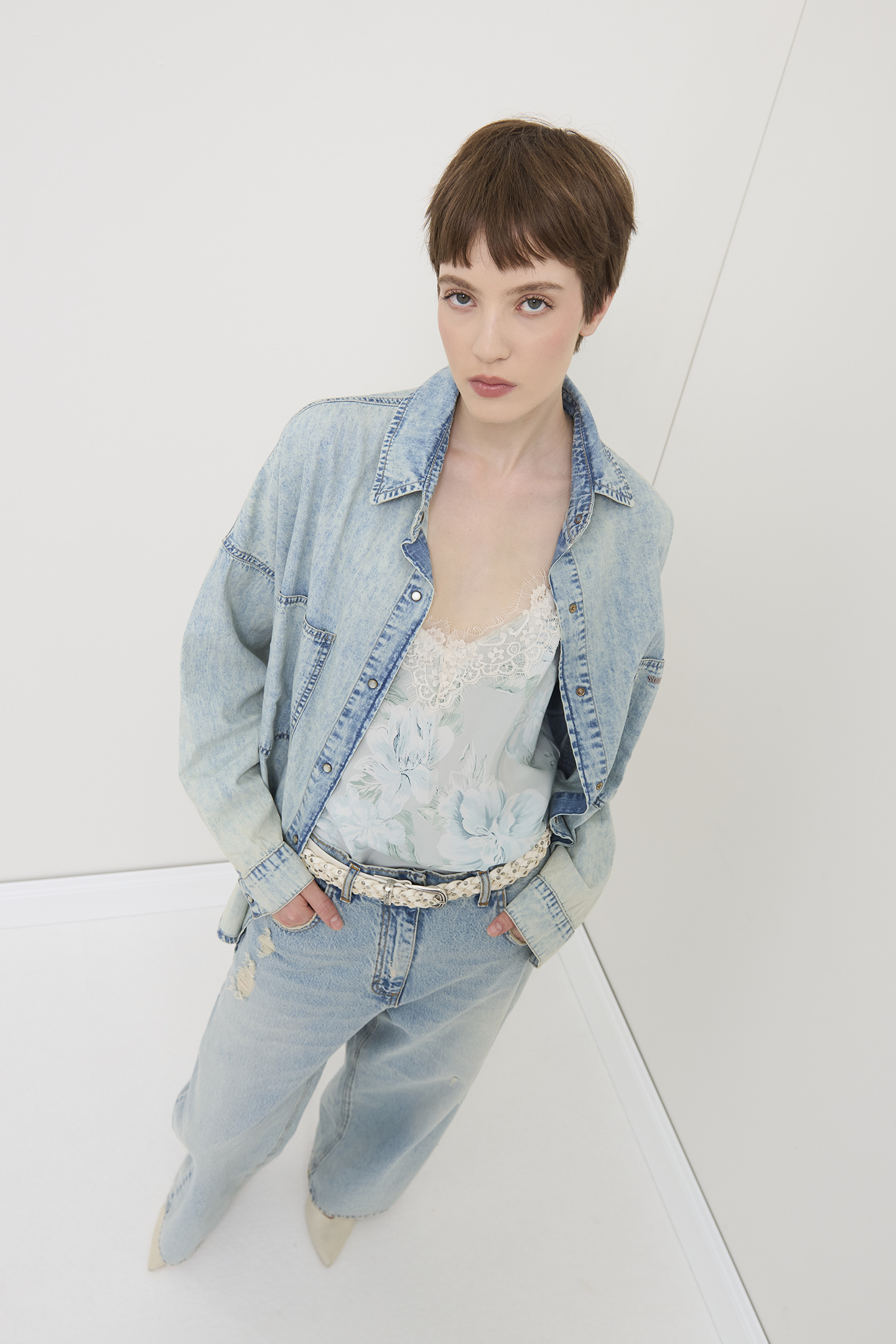 LINGERIE STYLE TOP MADE OF PURE VISCOSE WITH FLORAL PRINT. THE DESIGN FEATURES A DEEP V-NECK, FINISHED WITH SCALLOPED CHANTILLY LACE THAT ALSO EMBELLISHES THE BOTTOM HEM. THIN ADJUSTABLE SHOULDER STRAPS ENSURE A FLAWLESS AND COMFORTABLE FIT. THE MODEL IS 1.78 M TALL AND WEARS A SIZE 42 IT.