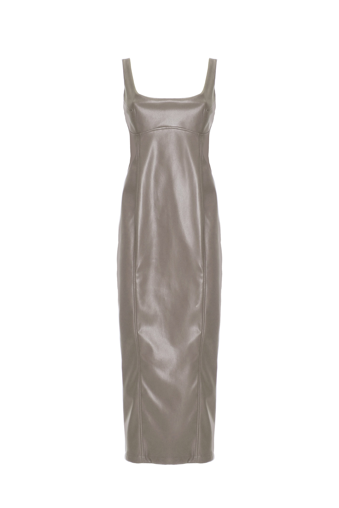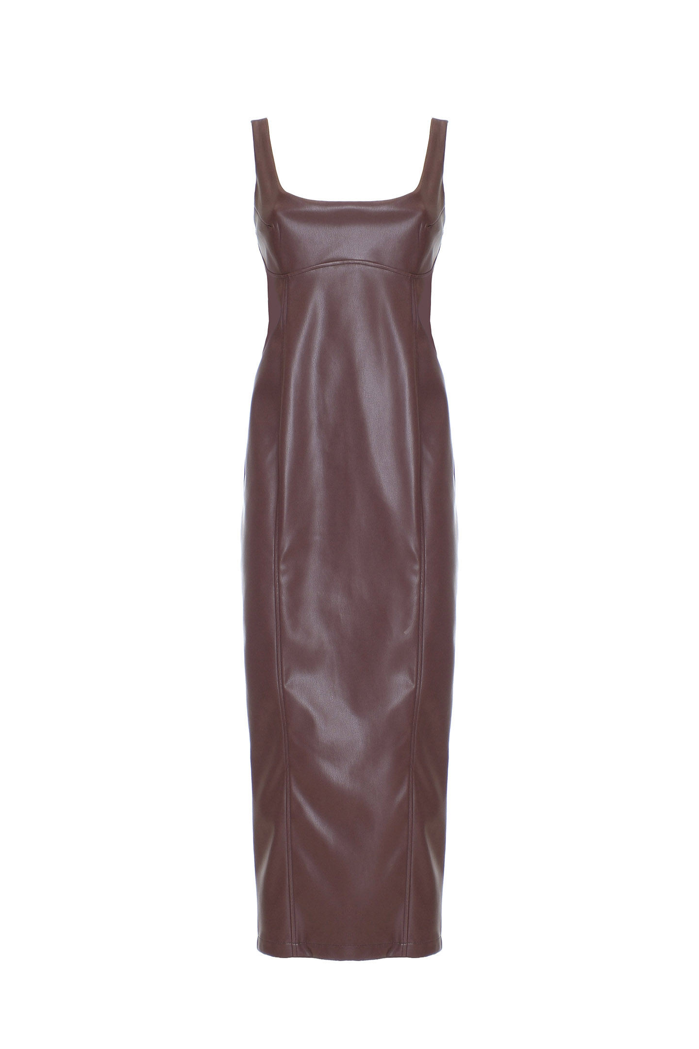 SLEEK MIDI SHEATH DRESS IN MATTE FAUX LEATHER WITH A REFINED TEXTURE.