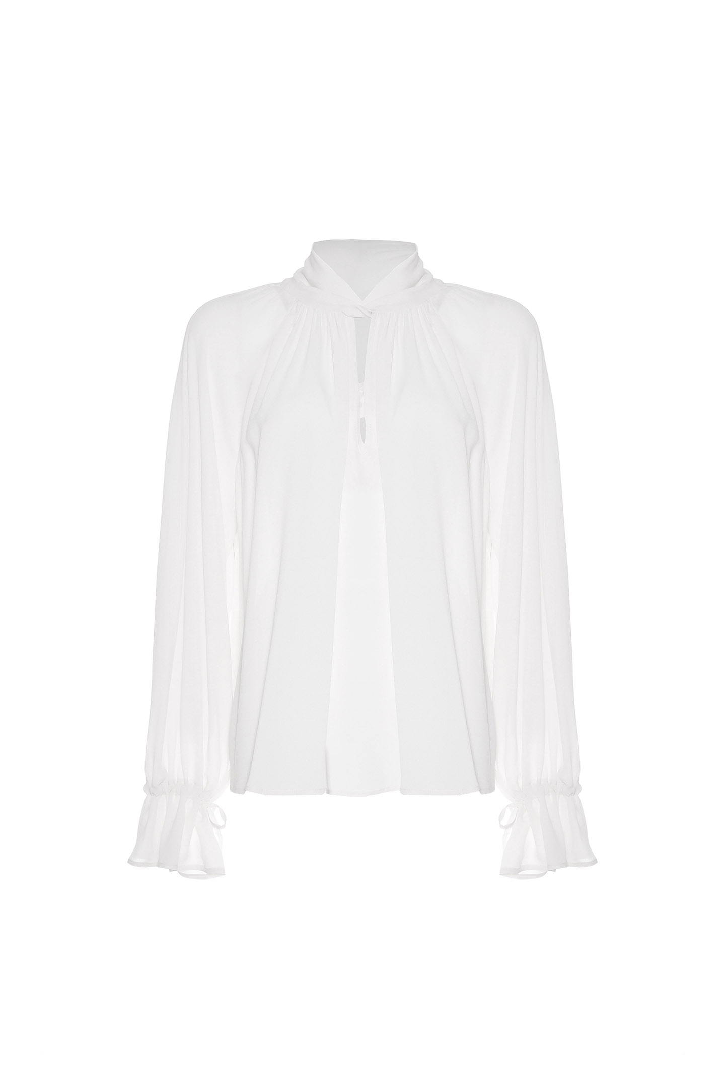 FLUID VISCOSE GEORGETTE BLOUSE. IT FEATURES A CROSSED KOREAN COLLAR ON THE FRONT WITH A TEARDROP OPENING AND WIDE SLEEVES FINISHED WITH LACES ON THE WRISTS. A GARMENT WITH A ROMANTIC AND BOHO-CHIC ALLURE, PERFECT TO COMBINE WITH BOTH JEANS AND TAILORED TROUSERS.