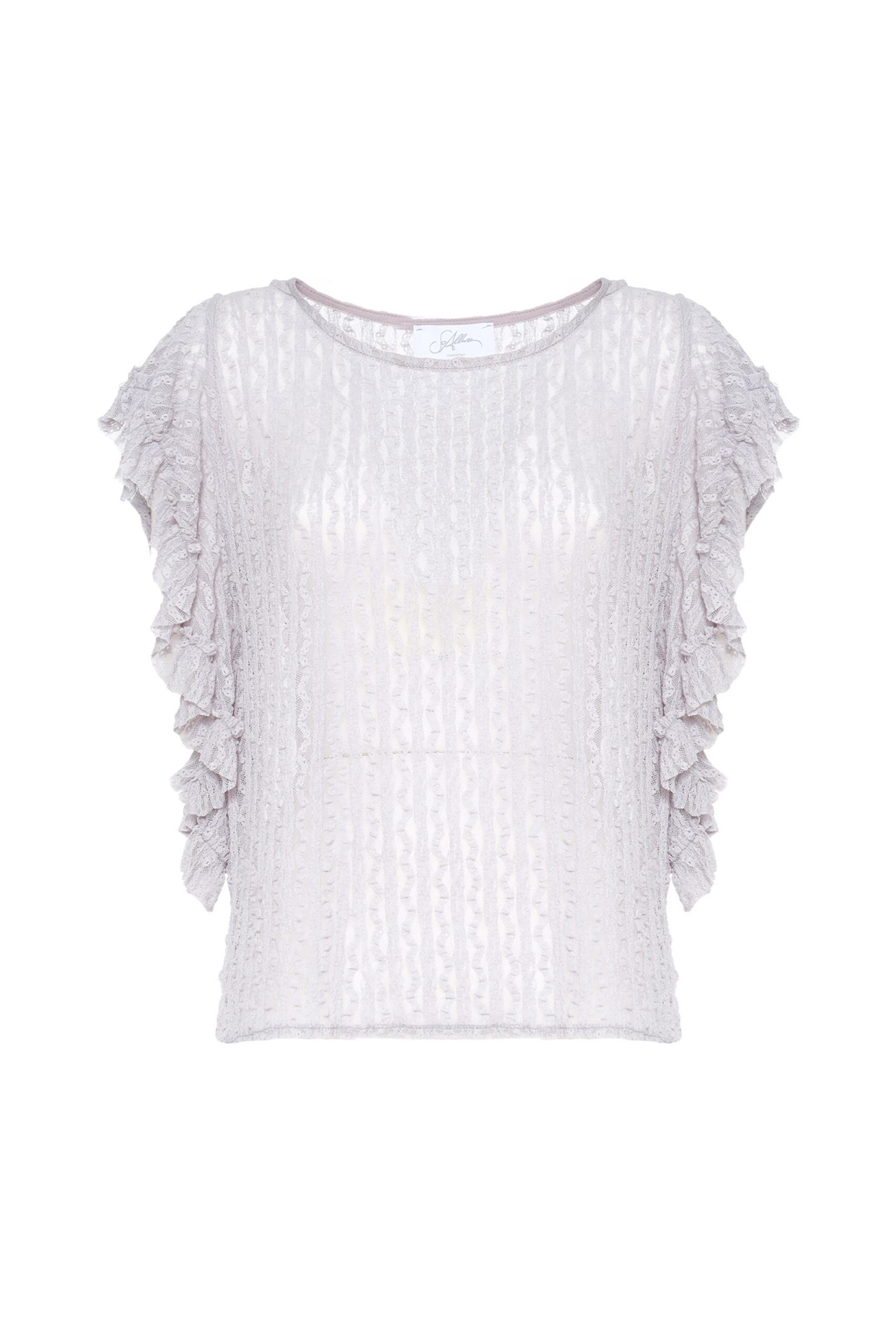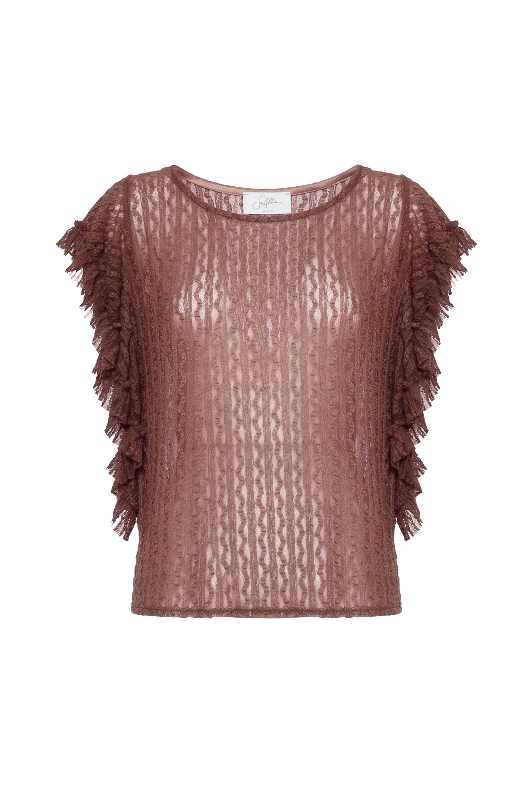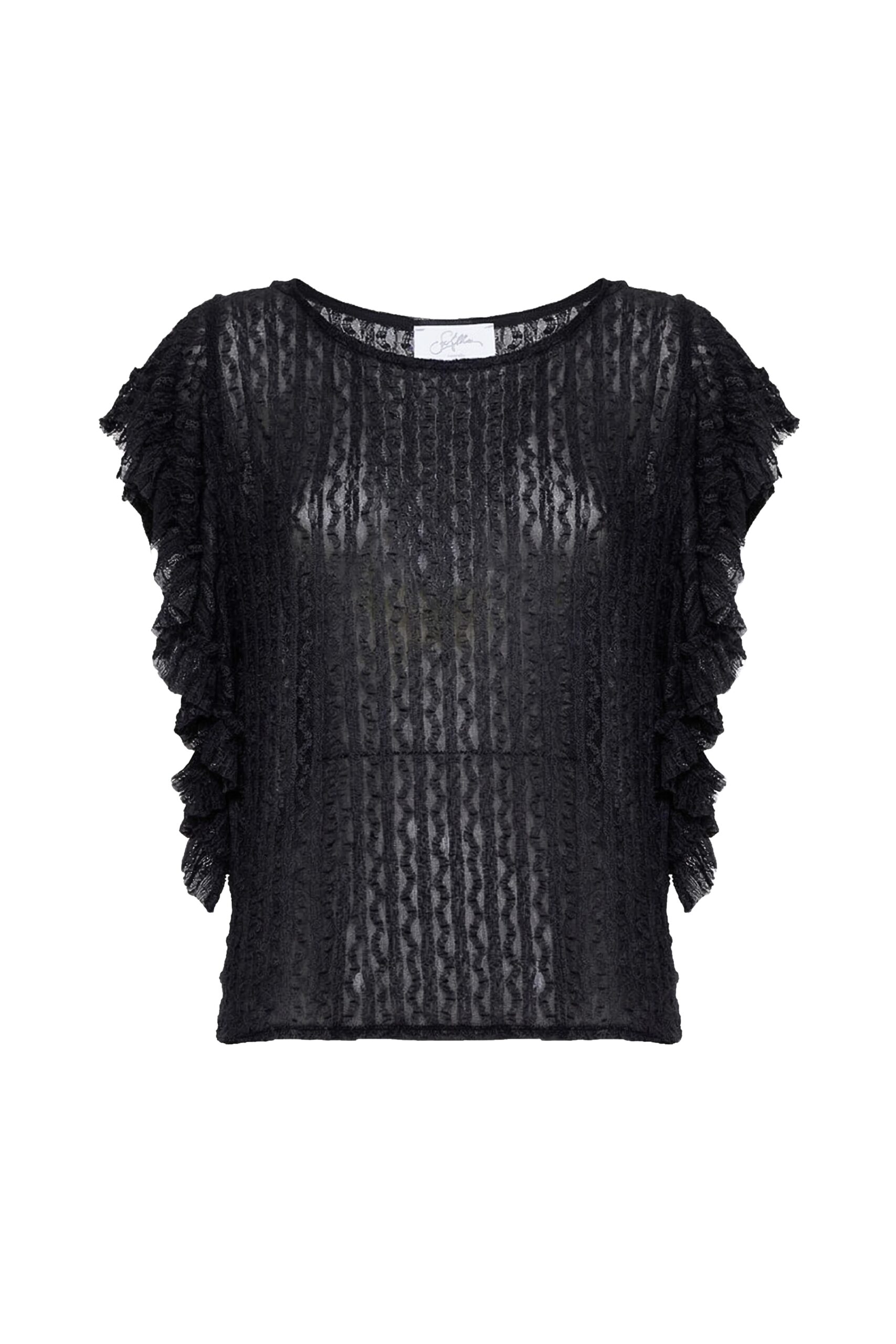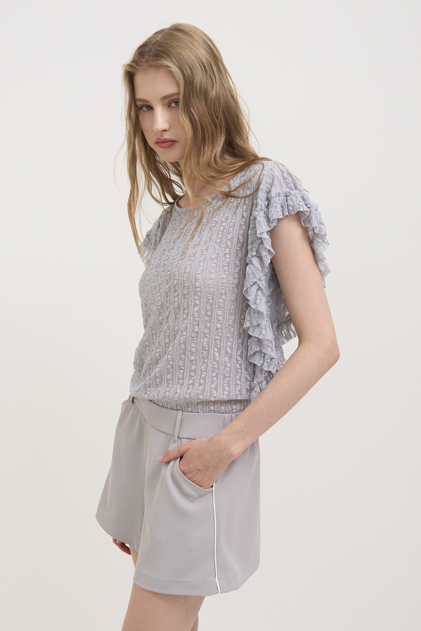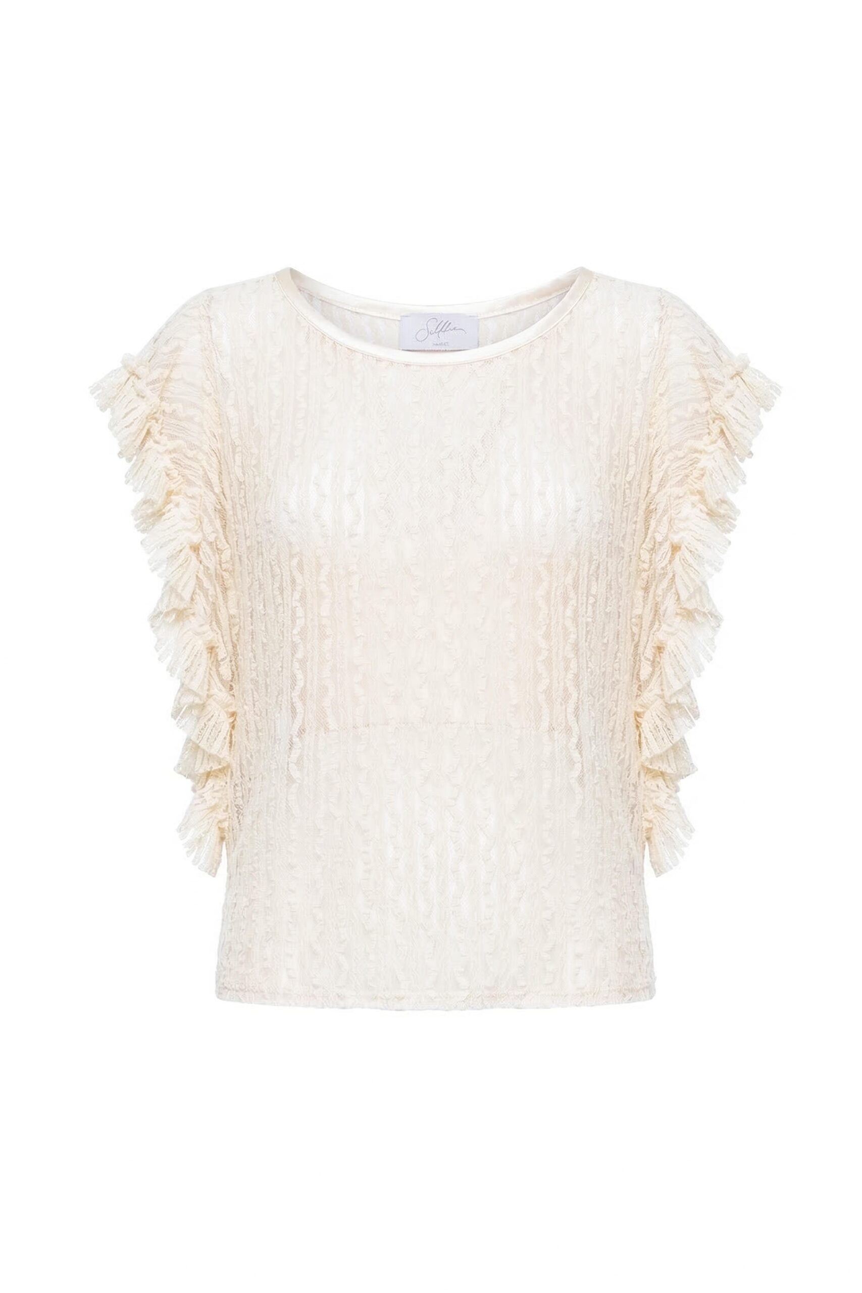TOP WITH CREW NECK MADE OF LACE WORKED WITH VERTICAL PATTERNS. THE DESIGN FEATURES A COMFORTABLE STRAIGHT LINE. IT FEATURES SHORT SLEEVES FINISHED WITH RUFFLES. A PIECE THAT STANDS OUT FOR ITS ROMANTIC AND CHIC AESTHETIC, IDEAL FOR FEMININE AND SOPHISTICATED DAY LOOKS. THE MODEL IS 178 CM TALL AND WEARS A SIZE 42 IT.